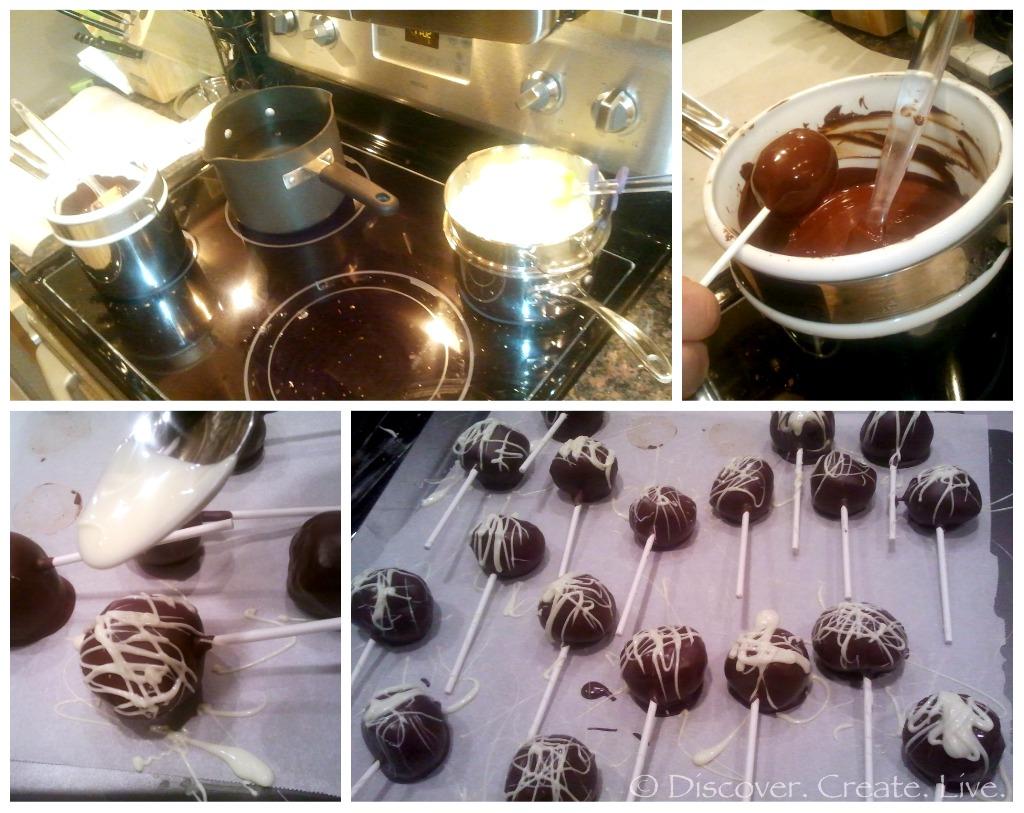 *{So to interject a story into these directions… When we made our cake balls we froze the balls without sticks in them first and then added the sticks just before coating them in baking chocolate. This had to be done quickly, because if they got too hot they sometimes came apart or looked sloppy. Well when we were 2/3 the way done we had a power outage… for 2 hours! (that was splendid) So what I did when the power was out was to just add the sticks to the remaining balls w/o covering them and then put them all back in the freezer (which had no power either, but hey I tried). Later that night when the power came back on, we started over with fresh chocolate for the remaining pops. Let me just say it was SO MUCH EASIER to dip the balls with the sticks frozen inside of them. and they looked better too! All of that story to explain why it’s helpful to add the sticks before the freezing stage instead of after :)}